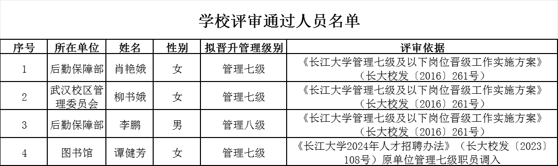 根据《伟德国际唯一官网入口管理七级及以下岗位晋级工作实施方案》(长大校发〔2016〕261号)、《伟德国际唯一官网入口2024年人才招聘办法》(长大校发〔2023〕108号)规定及学校2025年度管理七级及以下岗位晋级工作安排,学校岗位晋级与聘用工作小组对所有申报人员进行了审查,肖艳娥等4人通过审查,现将评审通过人员名单予以公示(详见附件)。